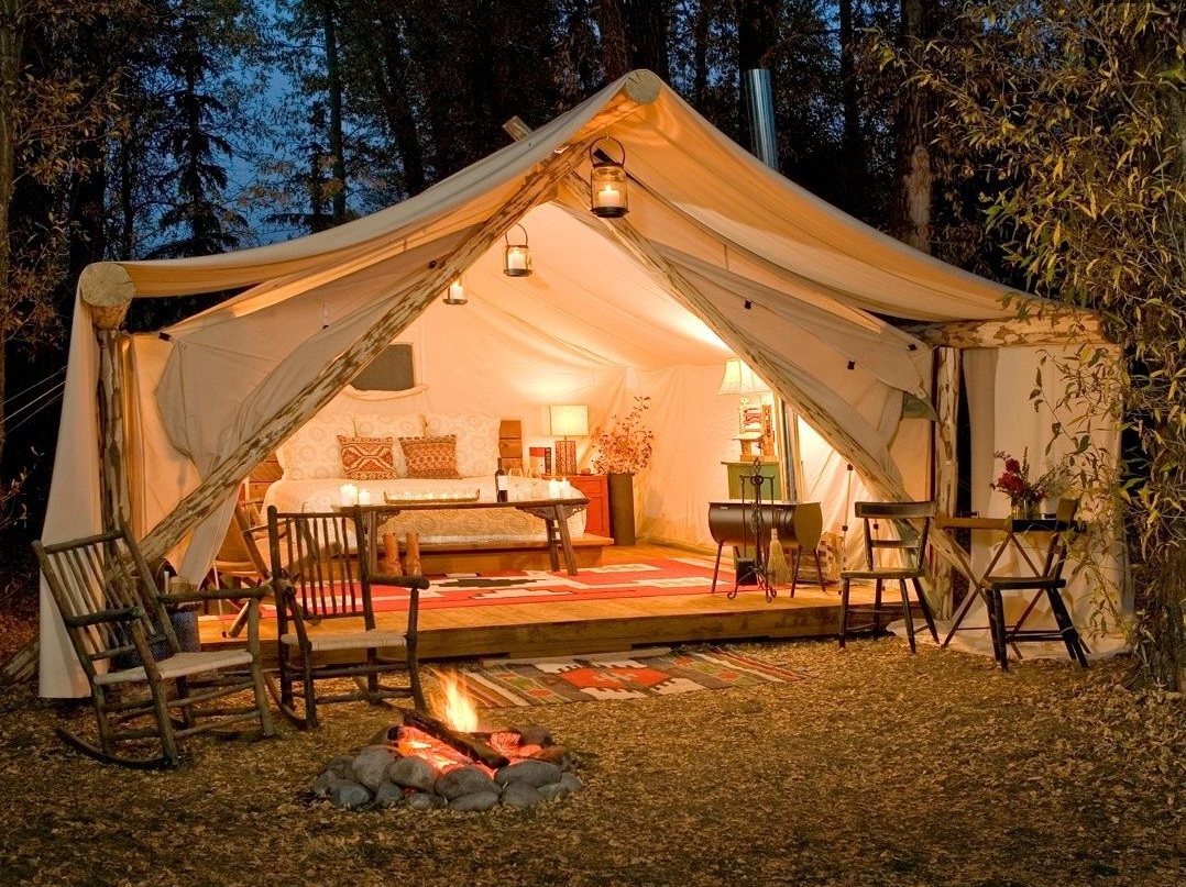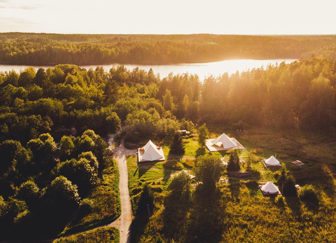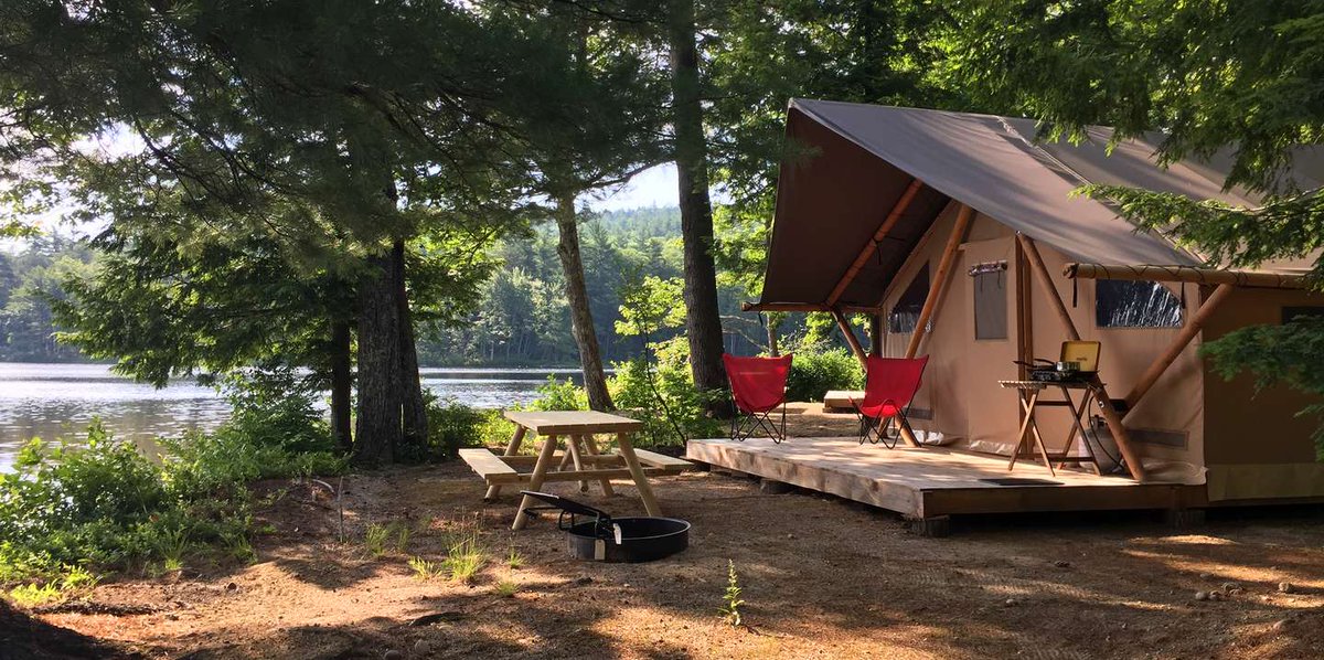 Земля для глэмпинга (кемпинг палаточного типа с комфортом) на берегу озера.